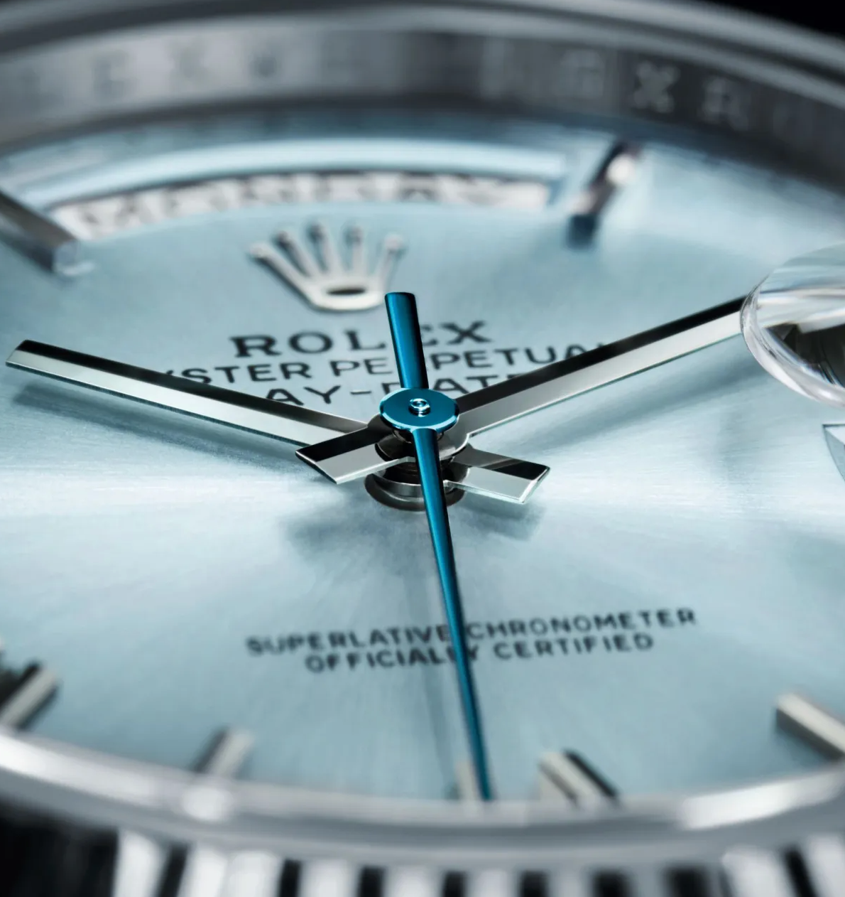 Hands in 18 ct white gold, blue coating on the seconds hand via PVD (Physical Vapour Deposition)